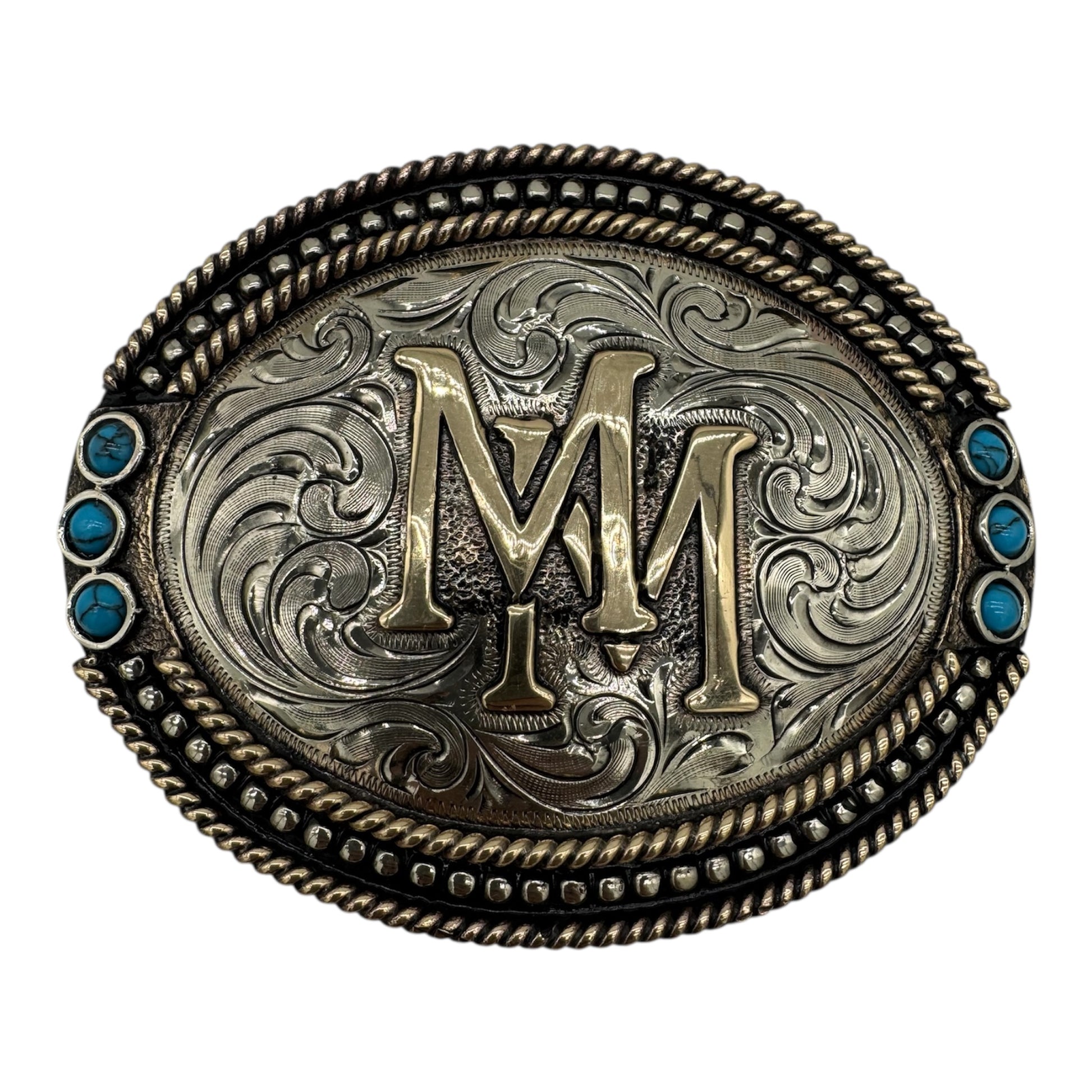 Elevate your western style with this handcrafted oval belt buckle, featuring a bold raised gold-tone initial over a beautifully hand-engraved antique silver background. Designed with classic western scrollwork, twisted rope edges, and turquoise stone accents, this buckle delivers a timeless ranch and rodeo look.