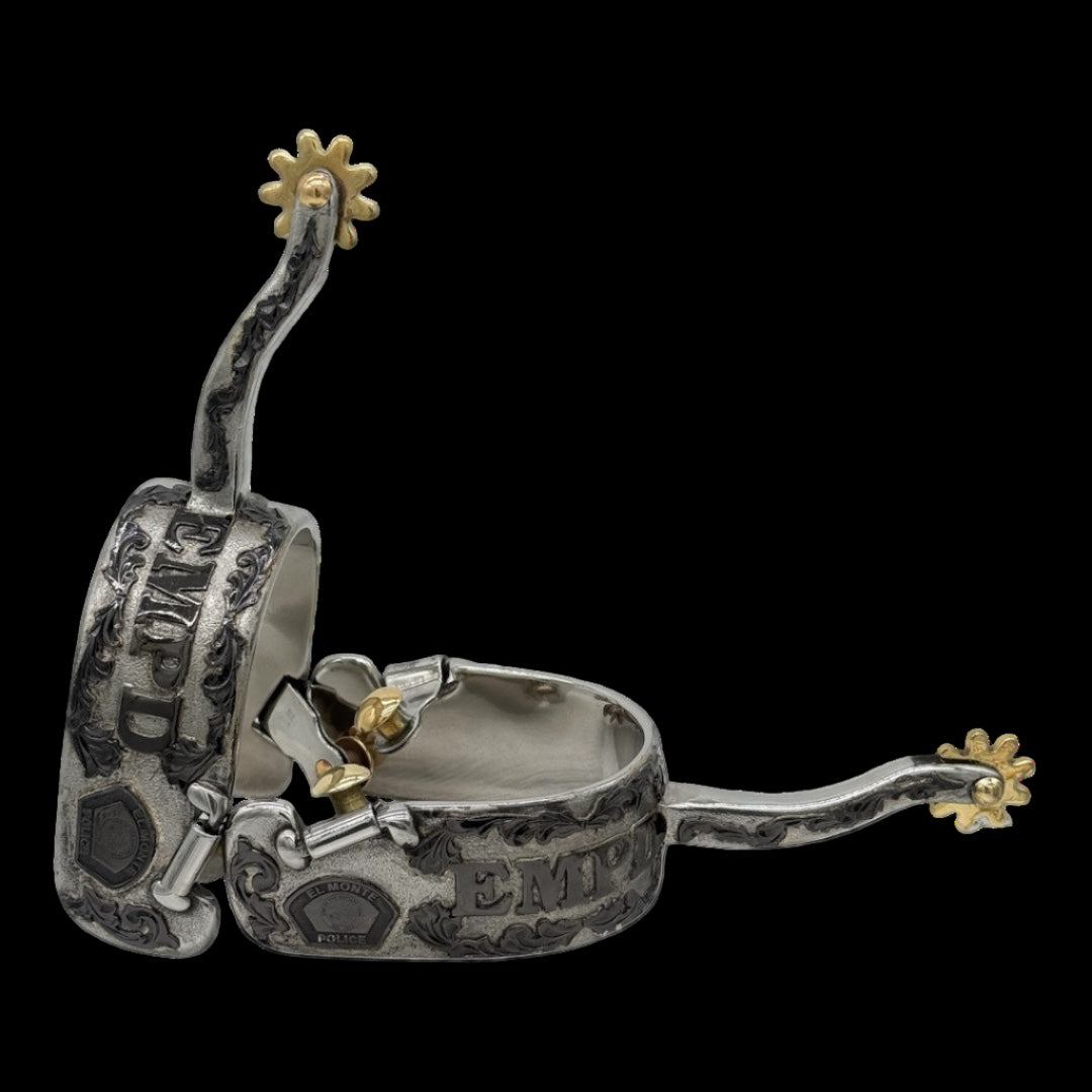 Honor, craftsmanship, and tradition — these Custom EMPD Spurs were designed exclusively for the El Monte Police Department. Hand-crafted with precision and pride, they feature detailed engraving, premium metalwork, and a mirror-polished finish that reflects the dedication and courage of those who serve.
